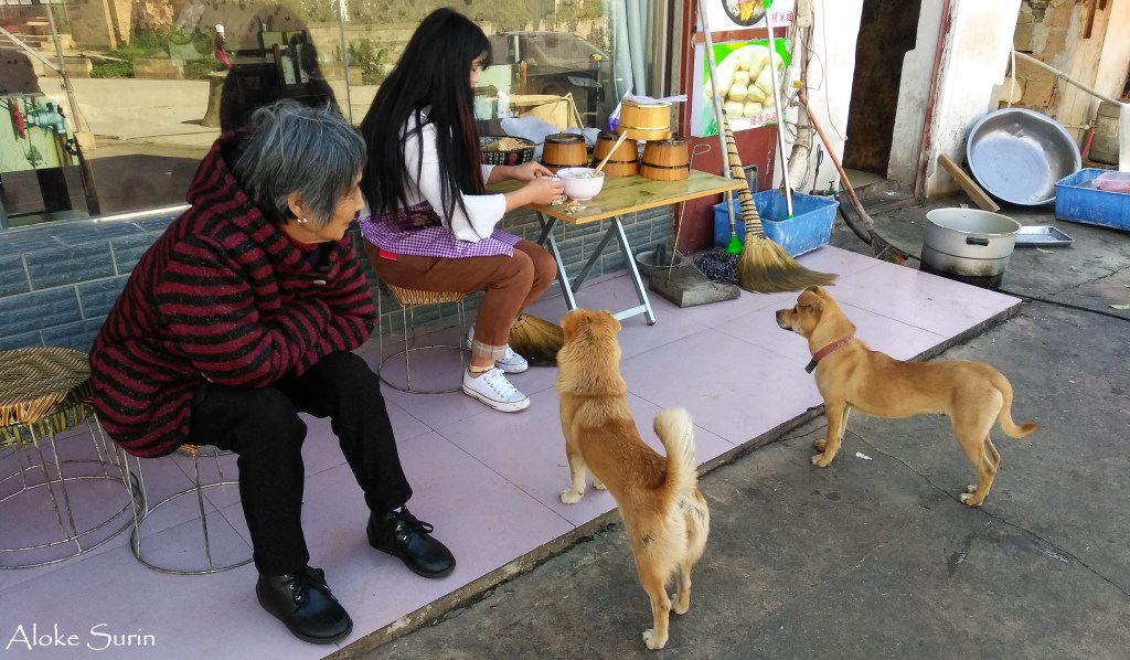 I took out my wallet and asked, “How much?” The woman shouted something in Mandarin and her young daughter appeared with a smart phone in hand. She punched a few digits and held out the display for me to see. I paid and walked into the large room which had some tables and chairs where patrons of the food cart could obviously eat. I ate contentedly and watched the world go by slowly. Two dogs came into the establishment and seemed to be quite at home amid the few people in the room. They looked like strays but obviously had been adopted by the owners. Strangely, this was a comforting scene. I had been away from Asia for six and a half years.