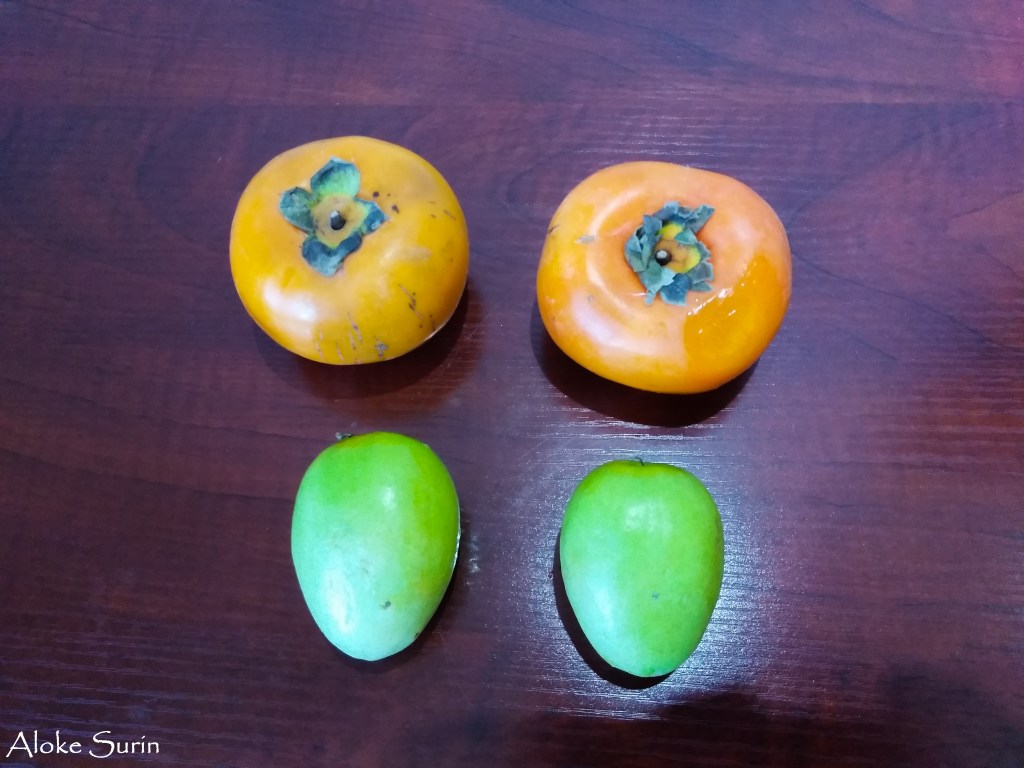 Still in this happy state of mind I walked into a small store and bought some fruit which for some reason appealed to my senses at that moment in time. The orange fruits I could recognize as being persimmons but the green ones were new to me. They resembled small green mangoes but I knew that was not the case.