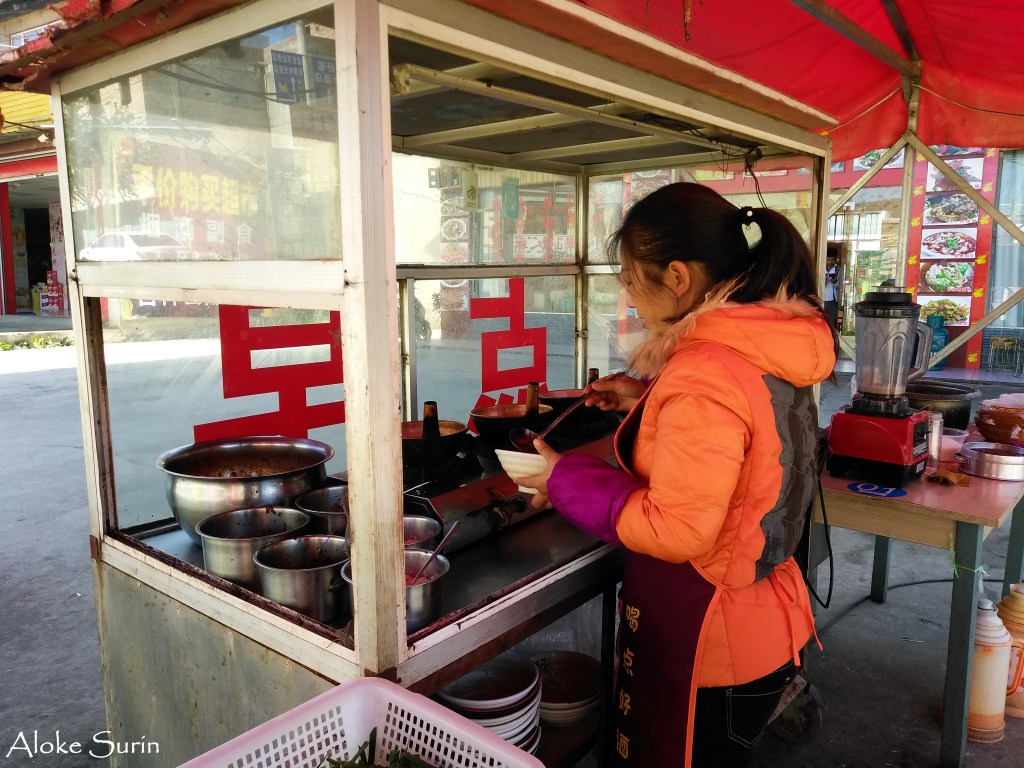 There was a food cart and appetizing smells were wafting from a pan that a lady was shaking expertly over a flame. I crept closer and looked with hungry eyes at the concoction of noodles and meat and vegetables that she was cooking. She got the message. A man appeared out of nowhere and with hand gestures suggested I buy a bowl. It was an easy sale.