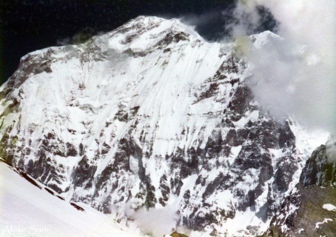 A few days later Asit, Bajraman and I ascended the little prominence almost at the bottom of the very long south east ridge of Dhaulagiri. Asit had read some accounts of the area where it had been referred to as “White Peak”. Looking back now with the wisdom of hindsight and experience I would blush to call it a mountain summit. But we were inexperienced and totally new to the Himalaya and it felt great to say that we had climbed White Peak! The highlight was the view of the stupendous south face of Dhaulagiri that we were treated to as we climbed.